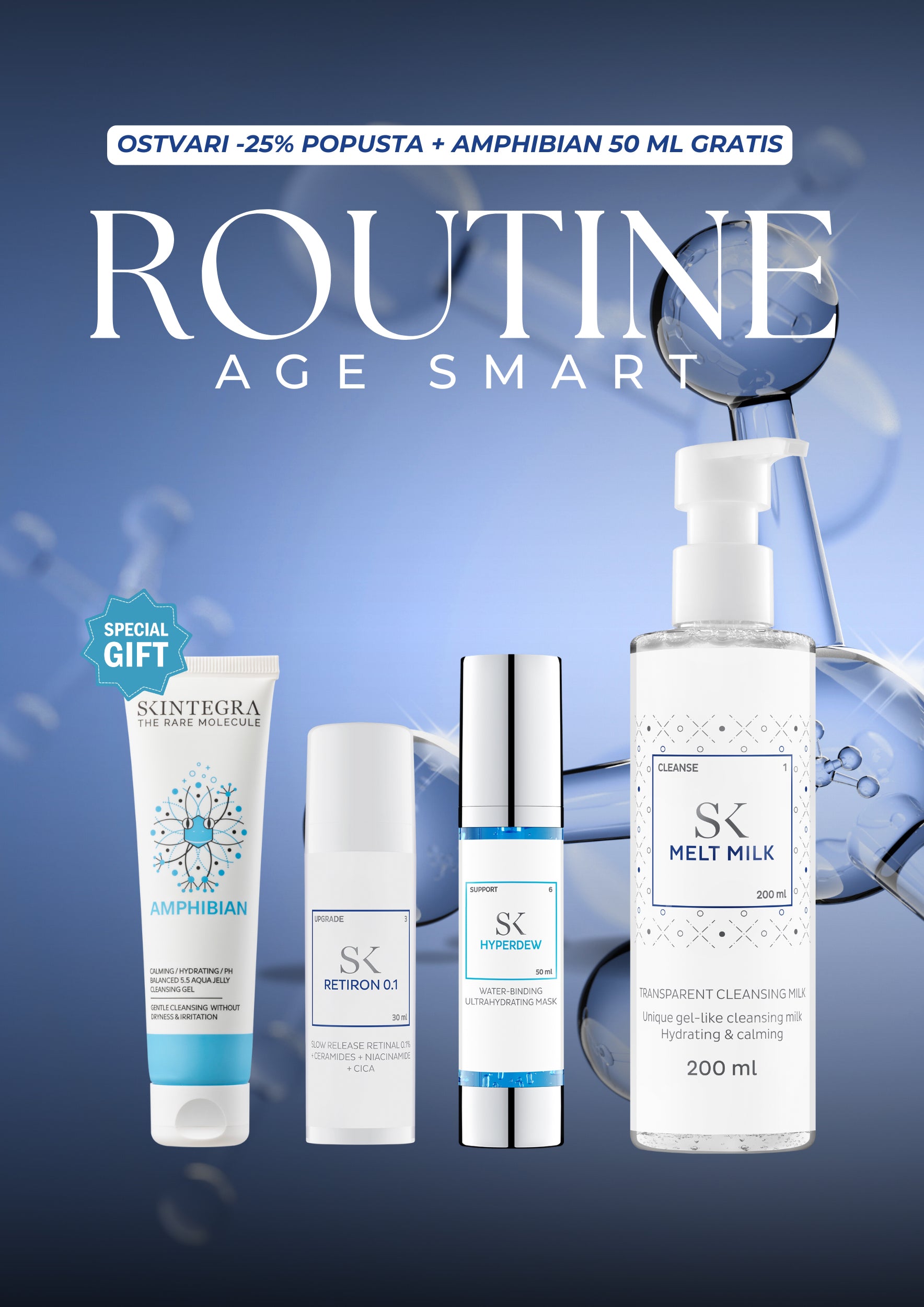 Set od tri proizvoda: Melt Milk čistač, Retiron 0.1 emulzija za poboljšani izgled kože i Hyperdew maska. Savršeno usklađena rutina koja čisti, obnavlja i hidrira kožu.