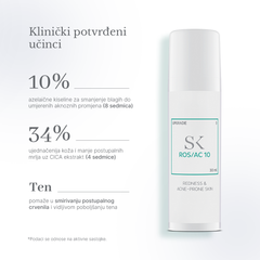 ROS/AC 10 je tretmanska emulzija s 10% azelaične kiseline, formulirana za pomoć u ujednačavanju tena te smirivanju kože sklone crvenilu i aknama.